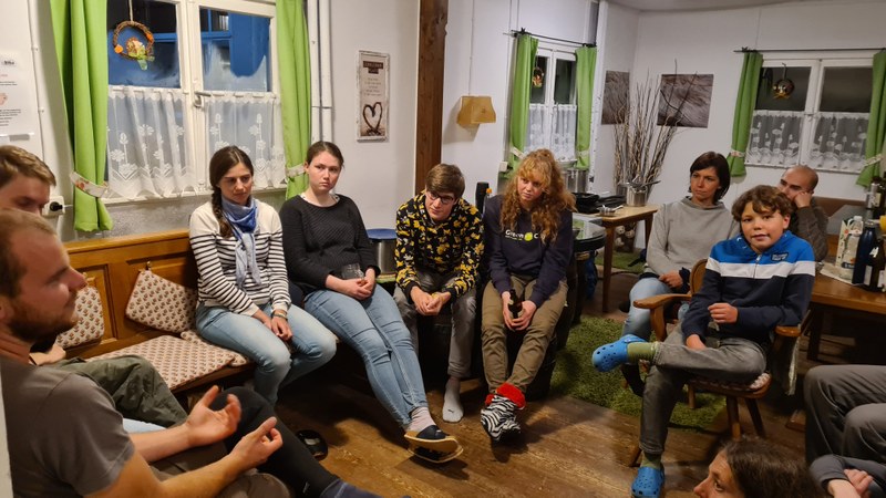 Hierfür erzählten uns Dominik Kopf, Stephen Wehner und Anna Kühn vom Bergwaldprojekt e.V. die Hintergründe und Zusammenhänge zu intakte Waldökosysteme, Wildbeständen und dem Klimawandel. Nur ein gesunder, gut durchmischter Bergwald bietet eine stabile Schutzfunktion vor Erosion, Lawinen- und Murenabgängen. An vielen Stellen in den Alpen ist der Schutzwald geschwächt, weil vermehrt Fichten für die Holzproduktion angepflanzt wurden oder das viele Wild junge Schösslinge frisst, so dass der Wald zunehmend lichter wird. Hier setzt das Bergwaldprojekt an und versucht durch Ehrenamtseinsätzen mit Pflanzaktionen sowie Pflege- und Schutzmaßnahmen die Wälder und ihre Ökosystemdienstleistungen wieder zu stärken. Die anschließende Diskussion in der Gruppe ging bis tief in die Nacht.