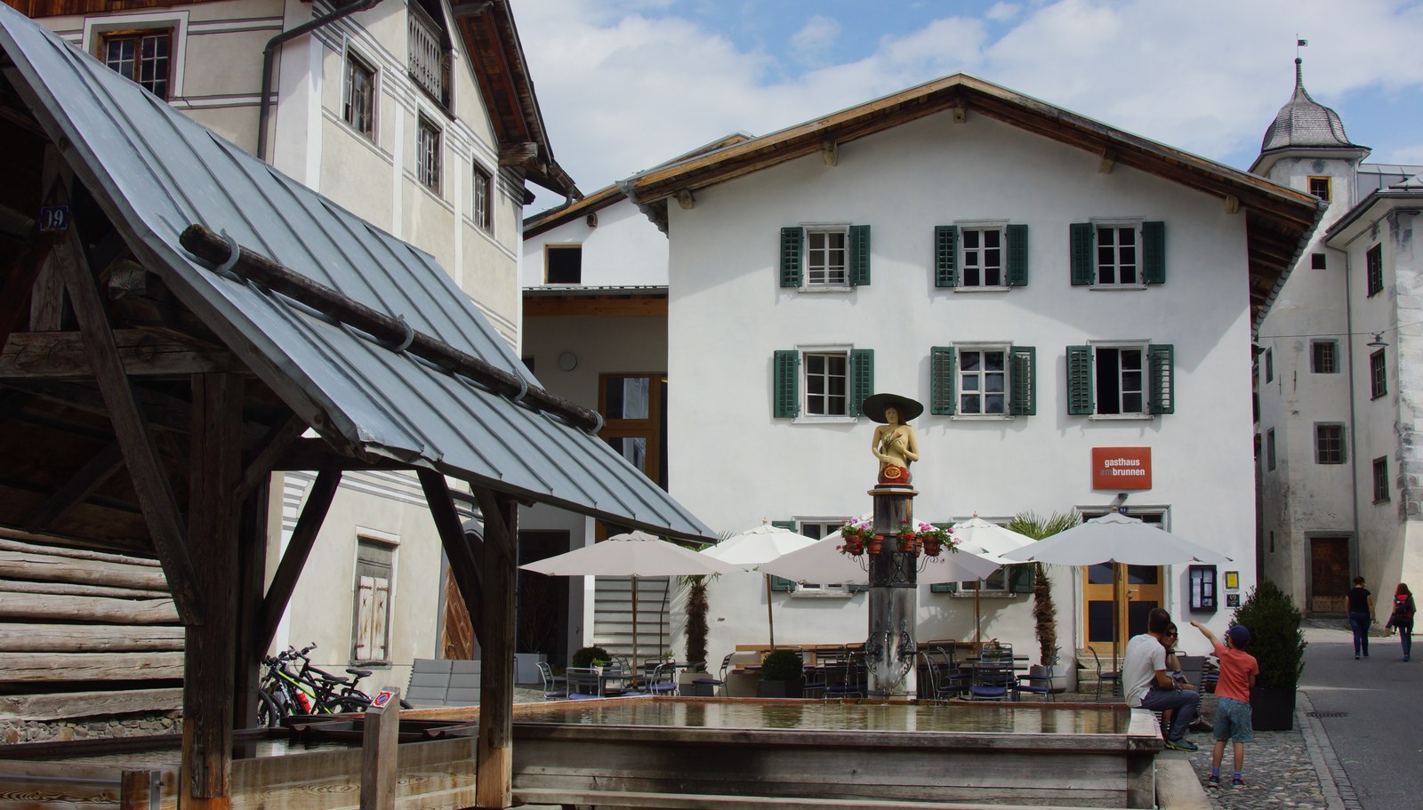 Eine junge Frau verlässt mit Einkäufen unter dem Arm den kleinen Dorfladen mit Tankstelle. Eine Familie sitzt auf den Holzplanken des Dorfbrunnens und studiert eine Touristenbroschüre. Das weiss getünchte «Gasthaus am Brunnen» füllt sich mittags mit hungrigen Handwerkern und Gästen. Ein ganz normaler Sommertag im 300-Seelen-Dorf Valendas in Graubünden, Schweiz. Doch in vielen Gemeinden in den Alpen sind solche Alltagsszenen nicht mehr selbstverständlich. Auch in Valendas nicht, wie ein Blick zurück zeigt.