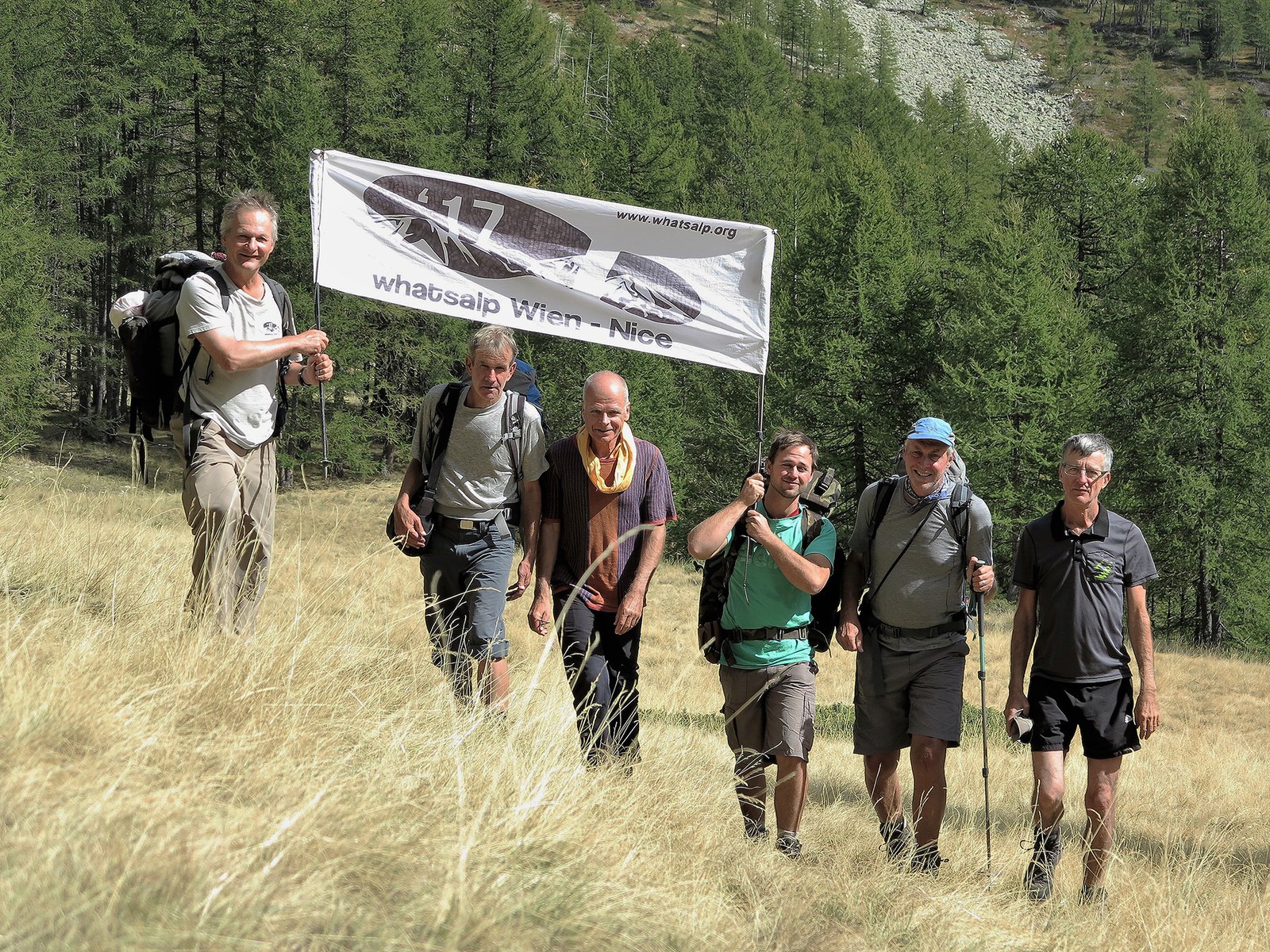 Auf der Fussreise von 1800 Kilometer begleiteten etappenweise rund 200 Mitwandernde die Kerngruppe von whatsalp. Sie bestand aus den Schweizer Geografen Dominik Siegrist und Harry Spiess sowie aus den österreichischen Alpenexperten Christian Baumgartner und Gerhard Stürzlinger.