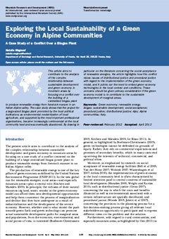 This article aims to contribute to the analysis of the complex relationship between sustainable development and green economy in mountain areas by focusing on a conflict over the building of a centralized biogas plant to produce renewable energy from livestock manure in an Italian Alpine valley. The case study shows that the project for a large-sized biogas plant promoted by the local political institutions as environmental modernization of local agriculture, and supported by the most important professional organizations, became increasingly controversial at the local community level and was eventually abandoned. By drawing in particular on the literature concerning the social acceptance of renewable energies, the article highlights how this conflict raises issues of distributional justice and procedural justice with regard to the implementation of the green economy model, and it points out the need to embed green economy technologies in the local context and conditions. These concerns should be given primary consideration if the green economy model is to contribute to the sustainable development of marginal areas.