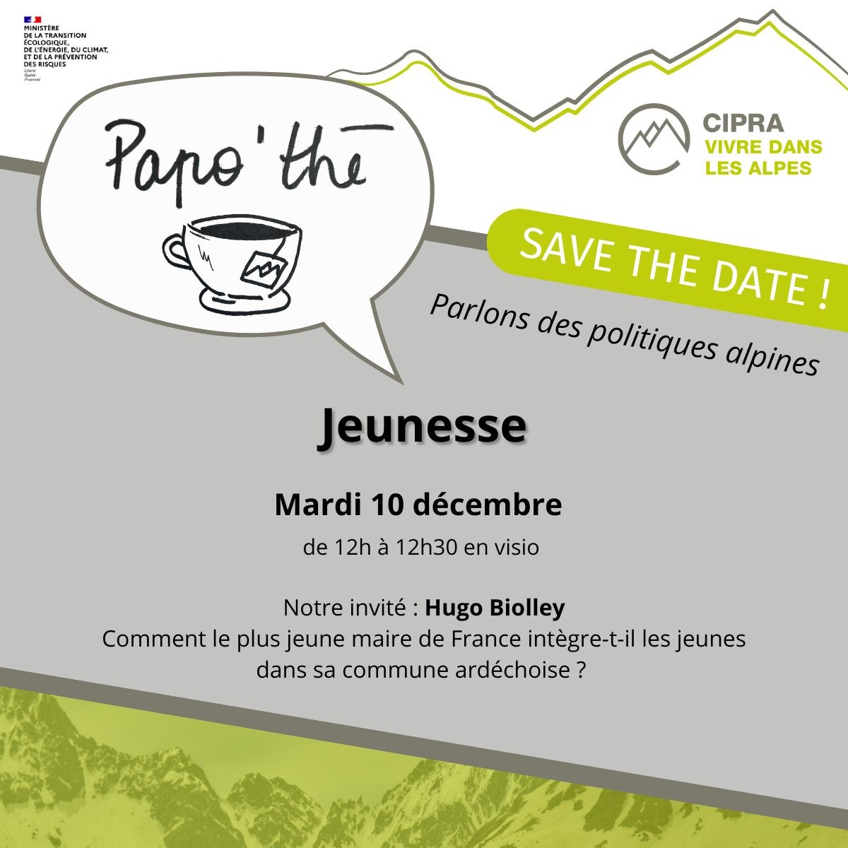 - Le prochain webinaire Papo’thé se tiendra mardi 10 décembre de 𝟭𝟮𝗵 𝗮̀ 𝟭𝟮𝗵𝟯𝟬, et portera sur le thème de la jeunesse. Nous serons accompagnés d'Hugo Biolley, plus jeune maire de France.
