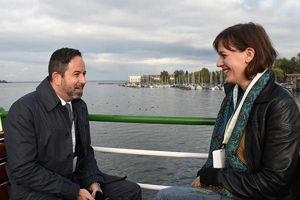 Sandrine Percheval, 35 ans, et Cassiano Luminati, 45 ans, s’assoient l’un en face de l’autre sur les bancs de la poupe. La Française et le Suisse oeuvrent tous deux en lien avec la CIPRA. Ils se rencontrent pour la première fois. Cassiano Luminati, à la barbe sombre et au sourire astucieux, a grandi dans la vallée isolée du Valposchiavo, près de la frontière lombarde. A 18 ans il a été séduit par des études d’architecture dans la ville trépidante de Milan. « La ville, la ville, la ville ! Je ne voulais que cela » s’exclame-t-il. Sandrine ajoute « et moi, je voulais le soleil, la plage, la Méditerranée et j’ai été faire mes études à Nîmes. »