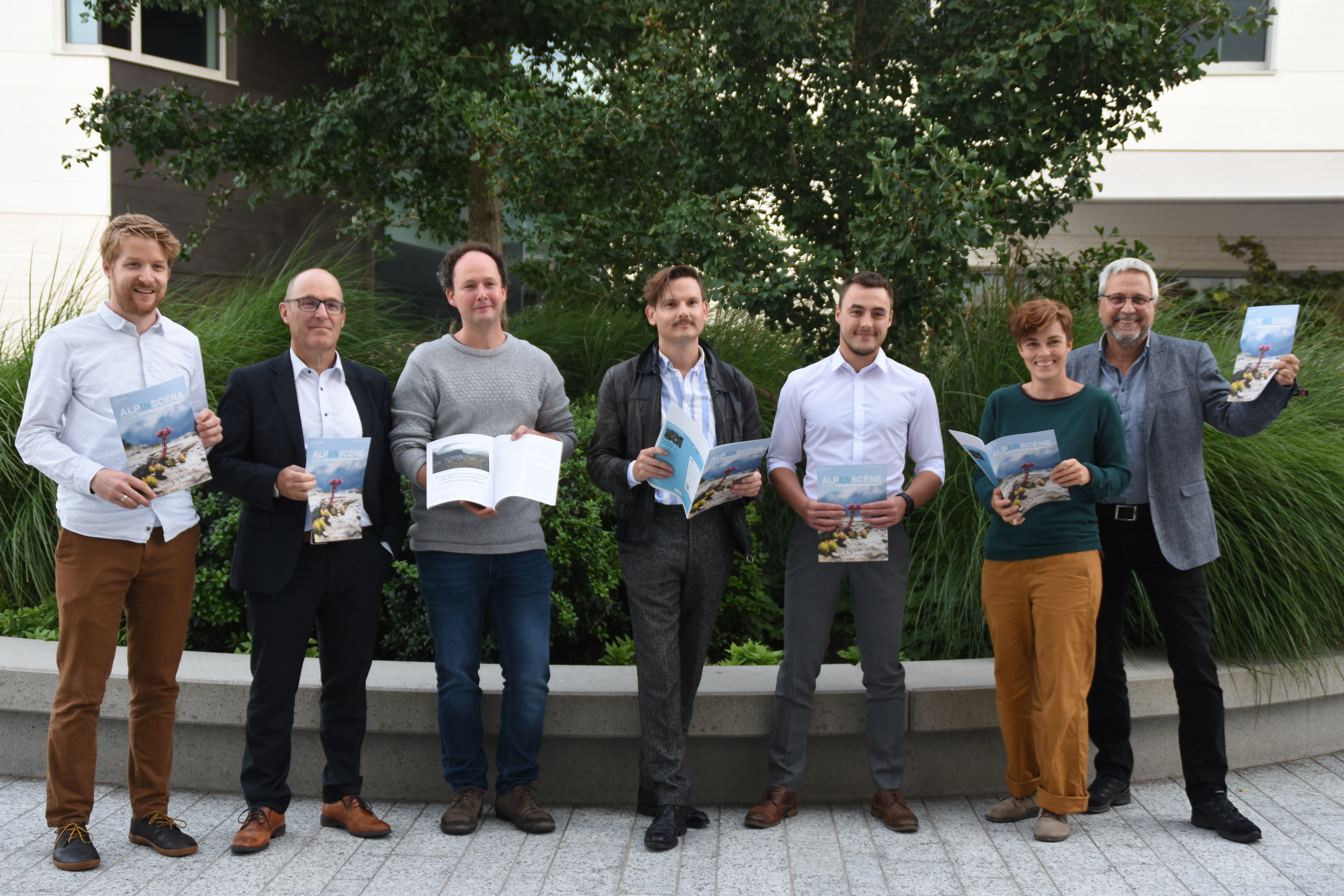 Von links: Michael Gams, Projektleiter Kommunikation CIPRA International, Thomas Lorenz, Geschäftsführer Stiftung Zukunft.li, Toni Büchel, Historiker & Verein Elf, Daniel Hoesl, Regisseur DAVOS, Sascha Thöny, Vorstandsmitglied SDG Allianz Liechtenstein, Bianca Elzenbaumer, Co-Präsidentin CIPRA International, Kaspar Schuler, Geschäftsleiter CIPRA International