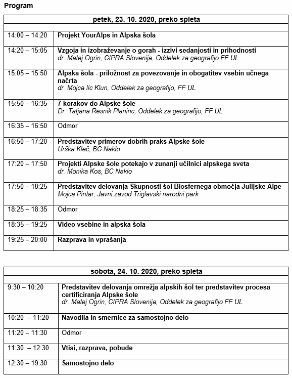 V Okviru projekta Skupaj za Alpe bo potekal seminar "Alpska šola v Sloveniji", namenjen učiteljem in strokovnemu kadru osnovnošolskega izobraževanja. Potekal bo v petek, 23. 10. 2020 in soboto, 24. 10. 2020, preko spleta. Seminar bo trajal 16 ur in bo ovrednoten z 1 točko za napredovanje.