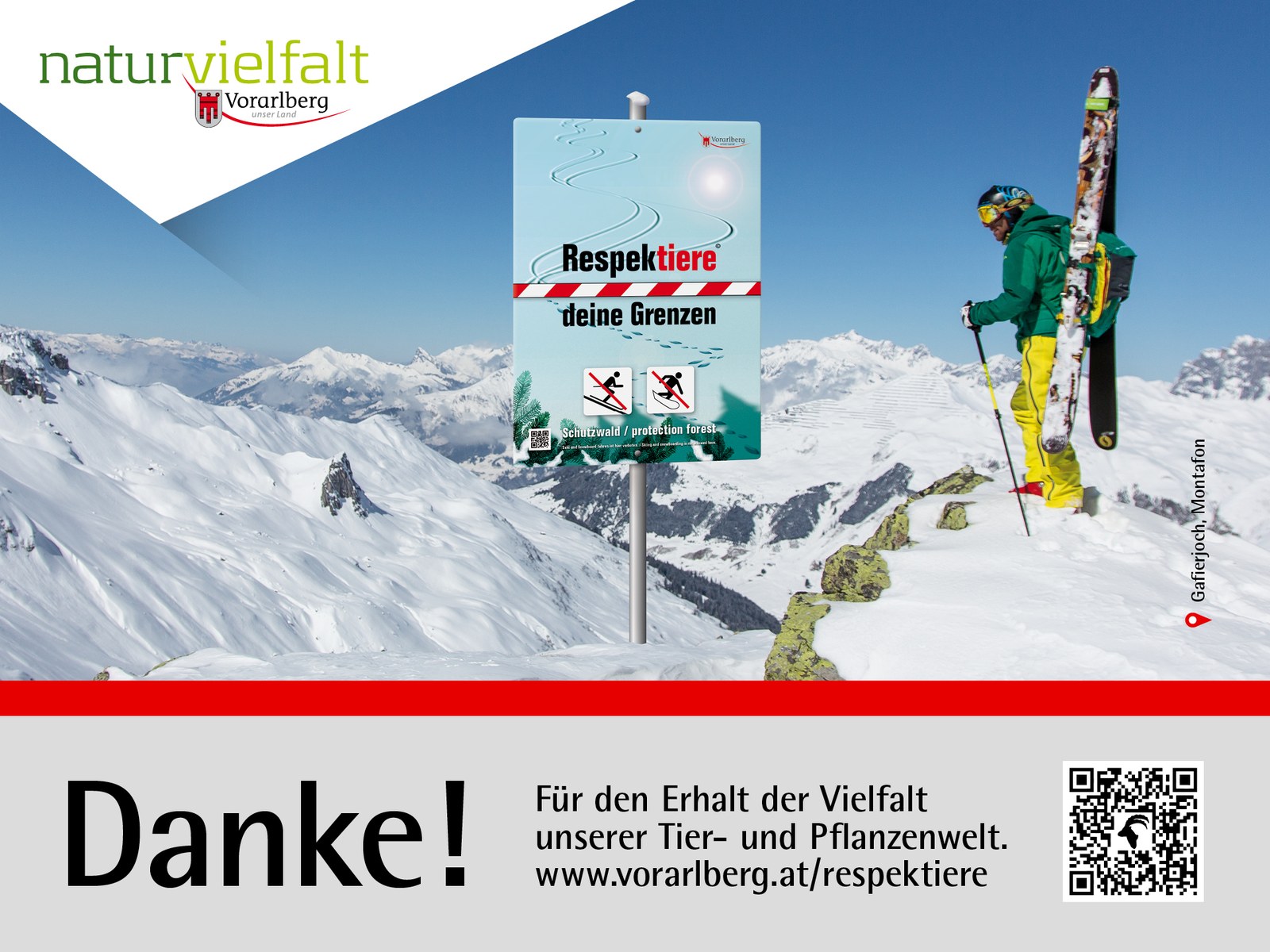 Kampanja daje glas in prostor tisti živalskim in rastlinskim vrstam, ki ga resnično potrebujejo. Opozorilne table z napisom »Respektiere deine Grenzen« [Spoštuj svoje meje] označujejo pomembna zavarovana območja v deželi Predarlski (Vorarlberg) in preprečujejo nezaželeno križanje poti med človekom in naravo. Omenjena območja so z ustreznim logotipom kampanje označena tudi na zemljevidih smučišč in planinskih poti. Od gorskih tekačic in tekačev, sprehajalk in sprehajalcev pa vse do gorskih kolesark in kolesarjev – v okviru kampanje so ciljnim skupinam napotki za okolju prijazno vedenje na voljo prek spleta. Interaktivni zemljevid denimo predstavlja priročen pripomoček pri načrtovanju »freeride« pustolovščin ali turnih dogodivščin – zmeraj s spoštljivim odnosom do narave.