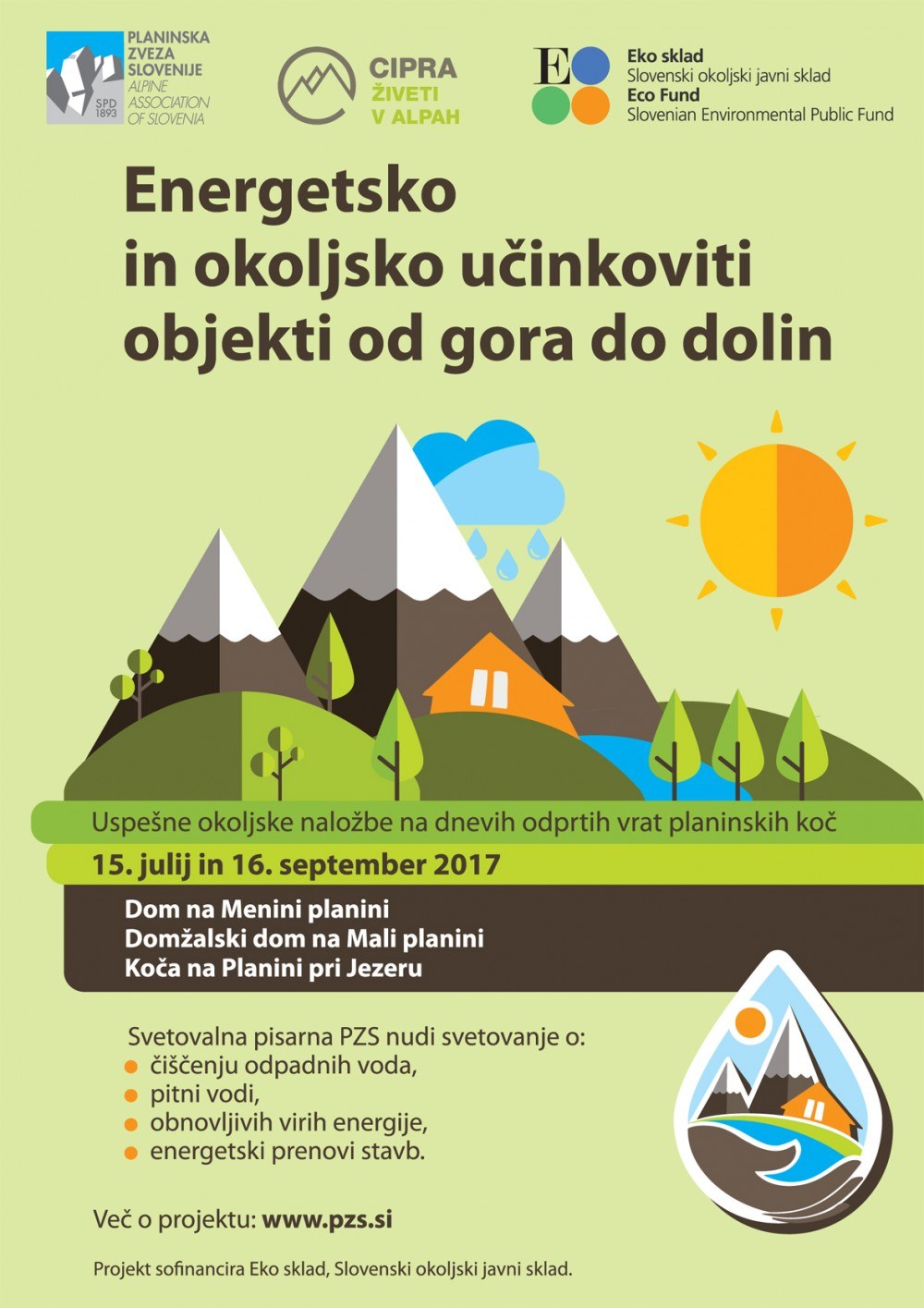 Planinska zveza Slovenije že od leta 2012 izvaja svetovalno pisarno za planinska društva, ki je osredotočena predvsem na področje čiščenja odpadne vode in urejanja pitne vode v planinskih kočah. Objekti, kot so planinske koče, lovske koče, ribiški domovi in podobni, ne dobivajo dodatne pomoči s strani države za okoljsko in energetsko izboljšavo. V veliko primerih imajo lastniki (večinoma so to različne vrste prostovoljnih društev) omejene vire finančnih sredstev za okoljske in energetske posodobitve svojih objektov, včasih pa tudi pomanjkanje znanja o možnostih, saj so nekatere energetske rešitve lahko tudi zelo poceni. Zato želimo s projektom omogočiti boljši dostop do informacij za lastnike takih objektov in v prihodnosti finančne spodbude tudi za te vrste objektov. Tako imajo lastniki objektov, kot so planinske koče, lovski in ribiški domovi in podobno, v času projekta možnost pridobiti brezplačno svetovanje na področjih čiščenja odpadne vode, pitne vode, obnovljivih virov energije in energetske prenove stavb.
